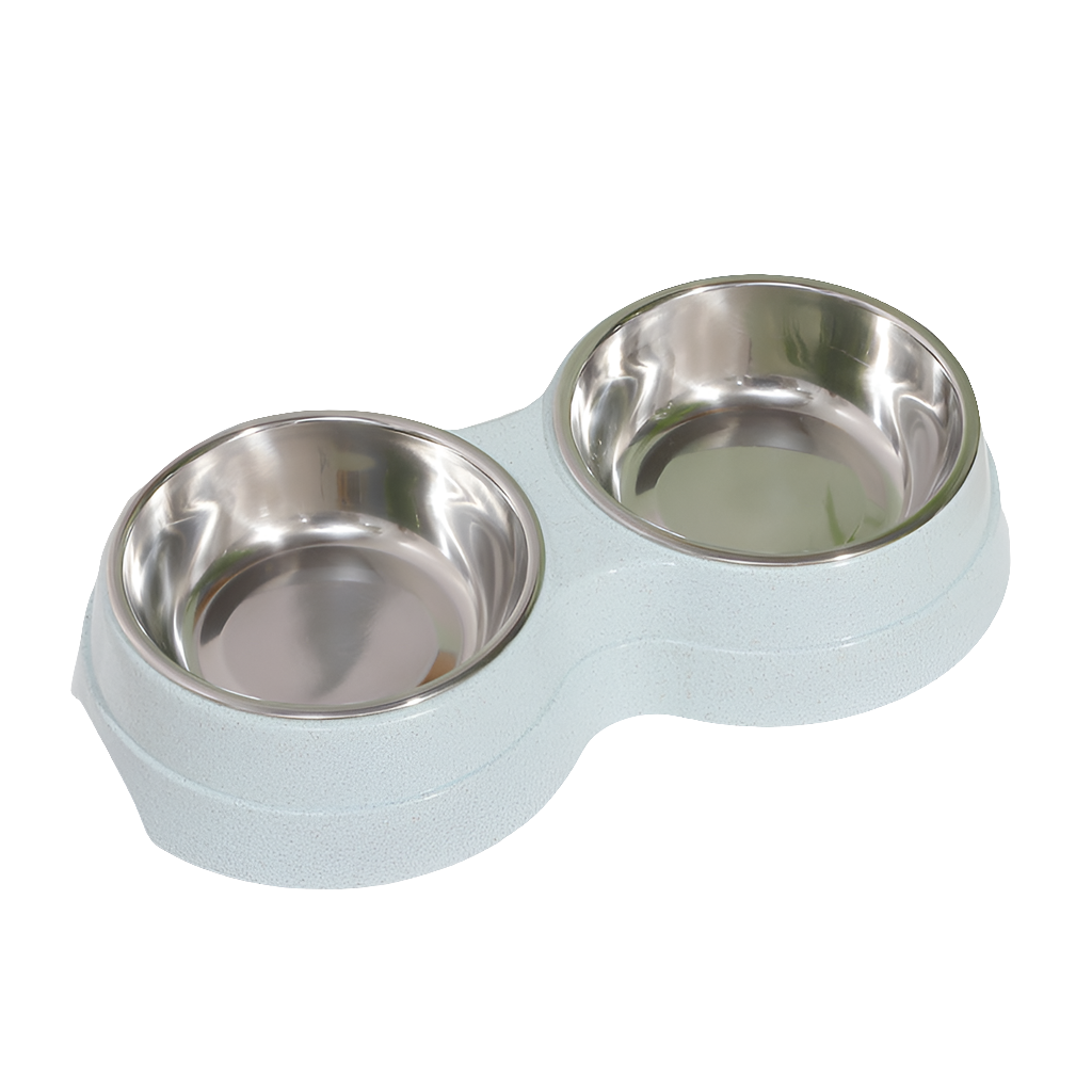 Hochwertigen Kunststoff mit 2 Edelstahl-Schüsseln. Super pflegeleicht, somit wenig